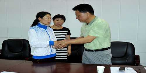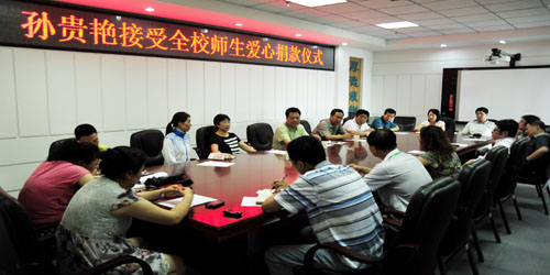 2014年7月4日上午11:30,在行政楼四楼会议室举行“孙贵艳接受全校师生爱心捐款”仪式。出席会议的有学校党委书记、校长徐兆东同志,学校纪检书记赵凯同志,学校工会主席曹丽萍同志,全校16个党总支和支部书记以及图书馆教师孙贵艳本人。