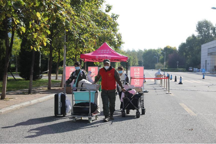 在志愿者的引领下,行李备品由电瓶车托运至寝室楼下,由志愿者运到寝室内。同学们来到了寝室,打开窗子,晾晒被子,勤劳的保洁阿姨定时进行消毒换气,可爱的辅导员和老师们还贴心地为他们打扫了房间。