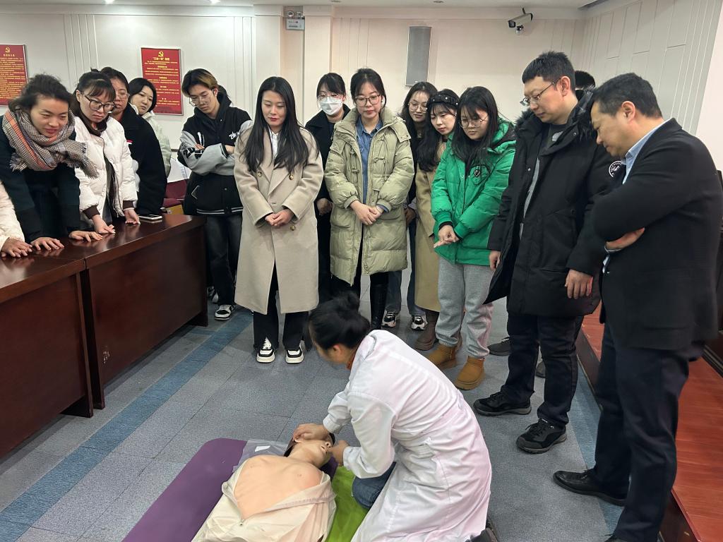 为了让学生们更好地掌握心肺复苏技能,卫生保健所张丽娜医生进行了现场实操演示。她详细讲解了心肺复苏的操作流程,包括正确的按压位置、力度和频率等关键要点。随后,将培训人员分成小组,在张医生的指导下师生们体验心肺复苏操作。通过实践,学生们更加深入地了解了这项关键技能,增强了应对紧急情况的信心。
