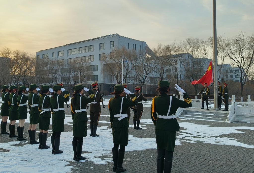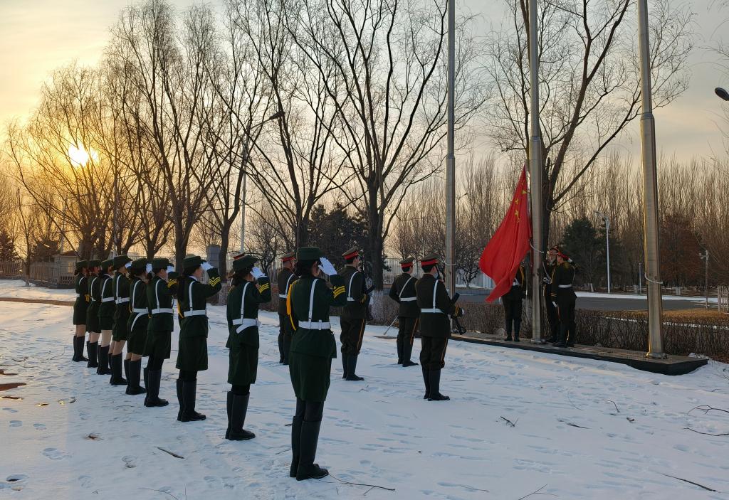 伴随着庄严的《中华人民共和国国歌》,五星红旗冉冉升起,迎风飘扬。在场的每一个人向国旗行注目礼,每个人的心中都充满了自豪感和使命感。