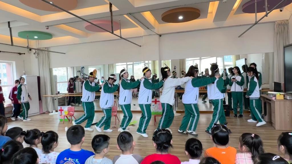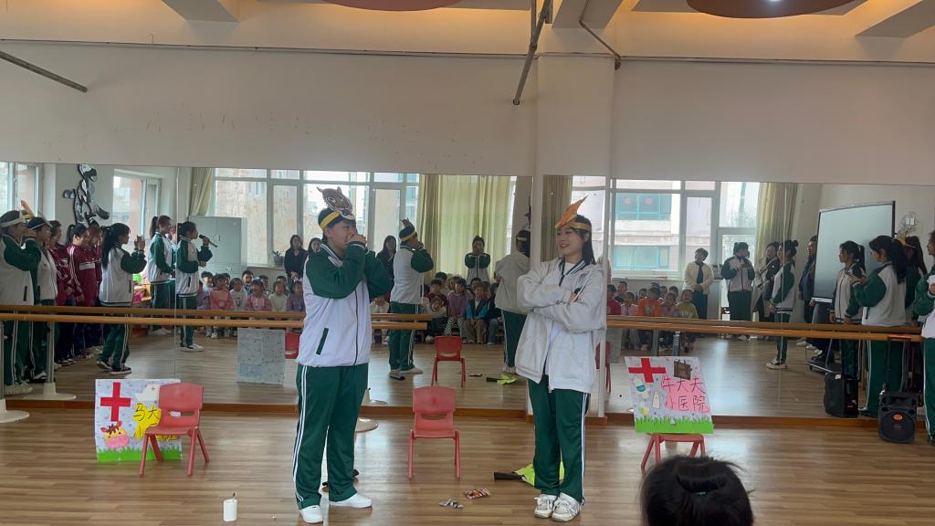 团学干部带来的儿童剧表演《大老虎爱吃糖》。学生们以狡猾的狐狸、爱吃糖又愚蠢的大老虎等形象出现在小朋友们面前,“被狐狸诓骗的大老虎吃了好多好多糖却不刷牙,结果捂着牙嗷嗷直叫,最后满嘴的牙齿都被狐狸拔掉了!”小朋友们被精彩的故事情节吸引,现场一片欢声笑语。