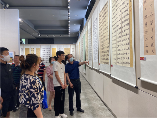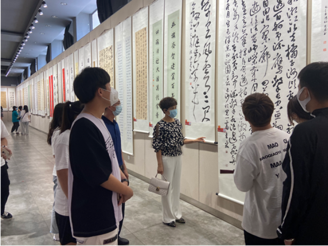 参观展览过程中,艺术教育专业教师现场讲解并指导,学生认真聆听,并细心观看每幅作品,学习我市书法家及书法同道的优秀之处,对作品的独特形式进行分析,对作品的笔墨技法加以揣摩,以便更好的运用到自己的书法创作之中。