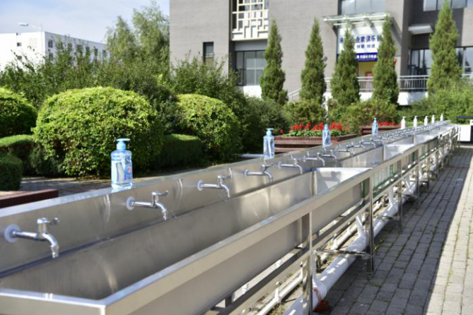学校对食堂也加强了管理,不仅要求配戴口罩,间隔1米排队进入食堂,还在食堂正门外增设了室外洗手台,在所有食堂入口安排人员测量体温。学生只有体温正常,双手进行清洗消毒后,才可进入。